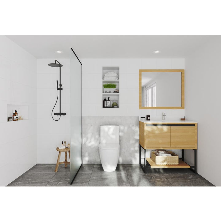 Elevate your space with the Alto Collection! This vanity will bring the New York penthouse vibe to your house. With its straight, simplistic lines and open bottom concept, the Alto collection offers elegance with a modernistic approach. The open bottom shelf can be removed so the vanity can be both wall mounted or freestanding to fit any bathroom design. The matte black, powder coated steel legs and black paint above the drawer offers contrast and chic style. Additionally, the handleless drawer design is embedded within an inner beveled frame. All this is accompanied with soft closing rails, dovetail construction drawers, and solid oak wood frame. Make the Alto collection the statement piece in your bathroom!