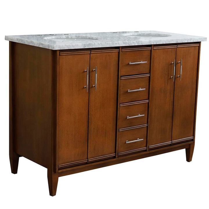 MCM vanities are available in 24”, 30”, 36”, 48” and 60" single sink models and 48” and 60” double sink models with a limited 54” double sink model available with a Carrara marble top.