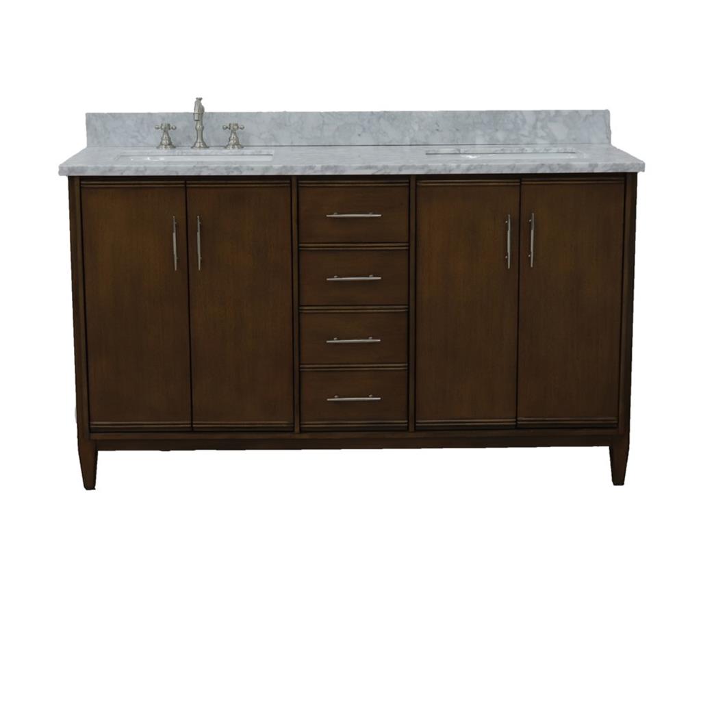 MCM vanities are available in 24”, 30”, 36”, 48” and 60" single sink models and 48” and 60” double sink models with a limited 54” double sink model available with a Carrara marble top.