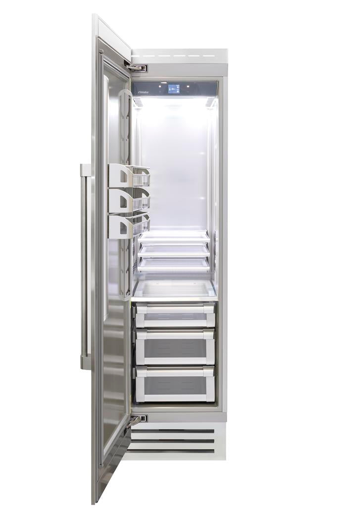 Fhiaba's unique quality also shows in the interior depth of their appliances. Most luxury, counter depth refrigeration can only accommodate shelves that are 12" deep. A six pack of your favorite beverage makes those shelves look nearly full. Fhiaba's shelves are 17" deep, allowing you to accommodate sheet pans and large pizza boxes all in the same standard-sized cases common in the industry. Fhiaba accomplished this magic by moving elements of the cooling system from the back of the units to one side. This innovative design also means that air in Fhiaba refrigeration circulates air side-to-side so less cooled air flows out of the appliance when you open the door.