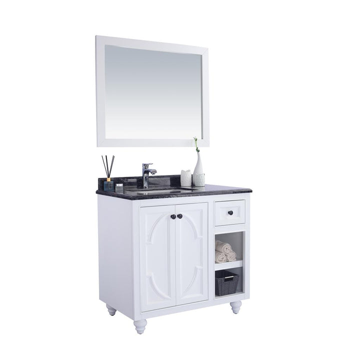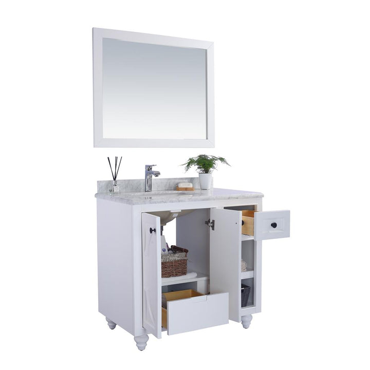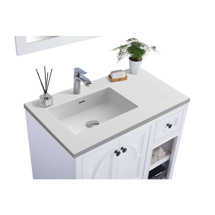 The Odyssey collection is a “work of art" fashioned into a vanity of worth, function, and style. From the top of the countertop, finished so eloquently by the double Ogee edge, to the grain within the finish, lavishly covering the cabinet in 2 colors: Classic White or Maple Grey. The brilliance of the well-thought out concept continues with open shelves and top drawer (on the 36" or larger models). This vanity also comes with an optional Toe-Kick assembly to cover the freestanding legs for a “built-in" approach. Available in single sink options in 24", 30", 36", 48", and double sink option in 60".