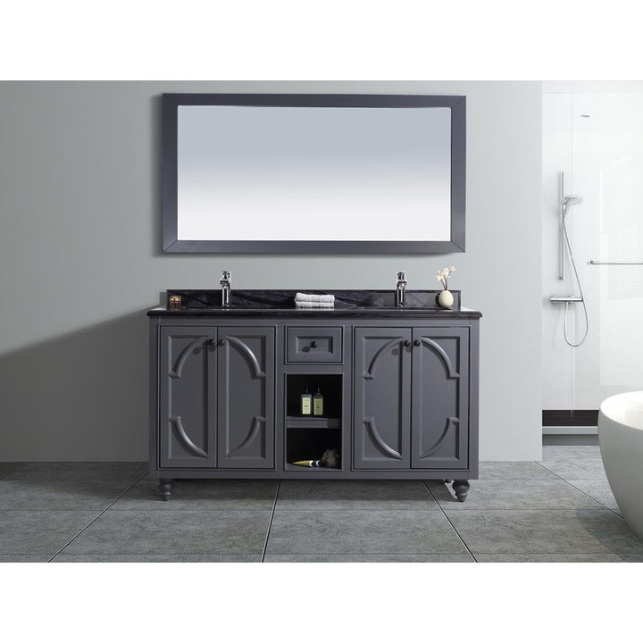 The Odyssey collection is a “work of art" fashioned into a vanity of worth, function, and style. From the top of the countertop, finished so eloquently by the double Ogee edge, to the grain within the finish, lavishly covering the cabinet in 2 colors: Classic White or Maple Grey. The brilliance of the well-thought out concept continues with open shelves and top drawer (on the 36" or larger models). This vanity also comes with an optional Toe-Kick assembly to cover the freestanding legs for a “built-in" approach. Available in single sink options in 24", 30", 36", 48", and double sink option in 60".
