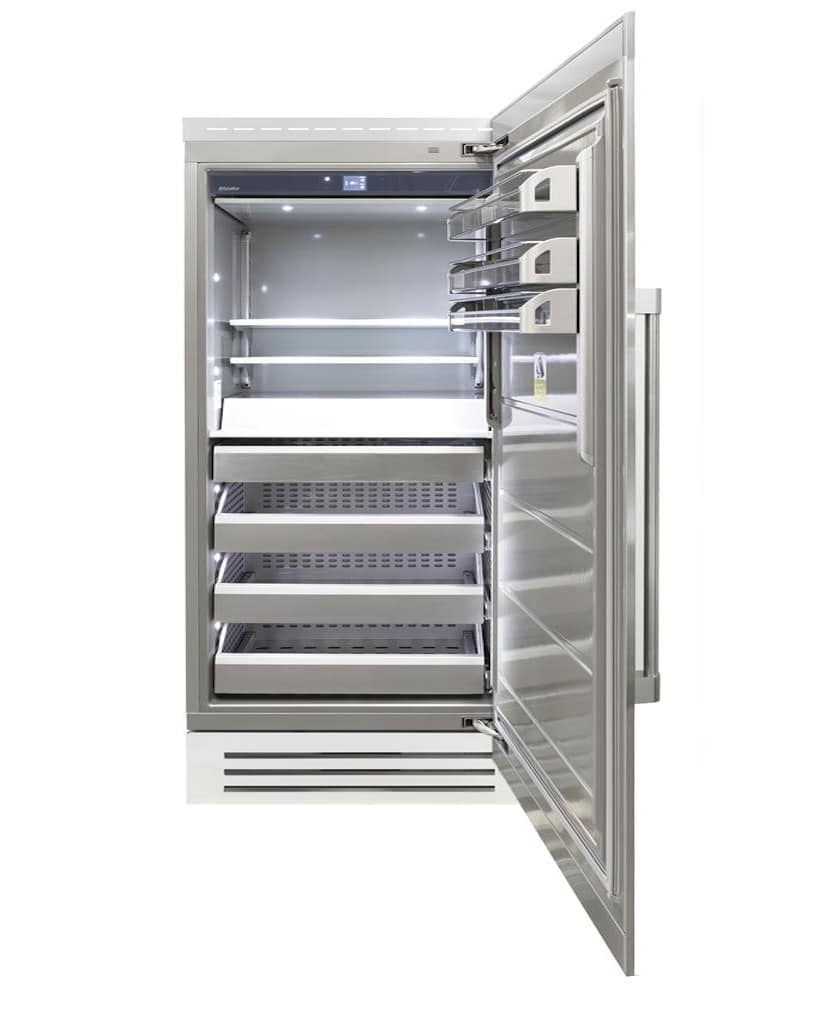 Fhiaba's unique quality also shows in the interior depth of their appliances. Most luxury, counter depth refrigeration can only accommodate shelves that are 12" deep. A six pack of your favorite beverage makes those shelves look nearly full. Fhiaba's shelves are 17" deep, allowing you to accommodate sheet pans and large pizza boxes all in the same standard-sized cases common in the industry. Fhiaba accomplished this magic by moving elements of the cooling system from the back of the units to one side. This innovative design also means that air in Fhiaba refrigeration circulates air side-to-side so less cooled air flows out of the appliance when you open the door.
