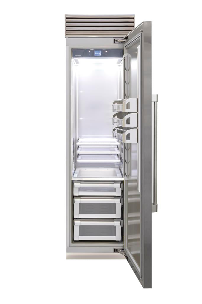 Fhiaba's X-Pro Series Refrigerator is designed for the best kitchens. The top grill hides the quiet compressor and offers your kitchen a distinctive pro look. The stainless steel interiors are beautiful and practical, helping to maintain stable temperatures. The Pro Stainless finish adds a sleek touch. Enjoy fresh, filtered water on demand from the internal water dispenser.